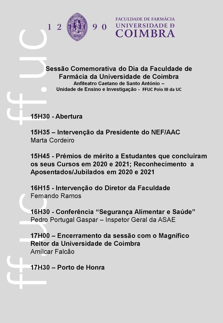 A a2ef2.uc, na pessoa do seu Presidente, esteve presente no dia 28 de abril, dia da Faculdade de Farmácia da Universidade de Coimbra. A cerimónia contou com os discursos do Magnífico Reitor, do Diretor da FFUC e da Presidente do NEF/AAC e incluiu a entrega de prémios de mérito aos estudantes que concluíram os cursos em 2020 e 2021.